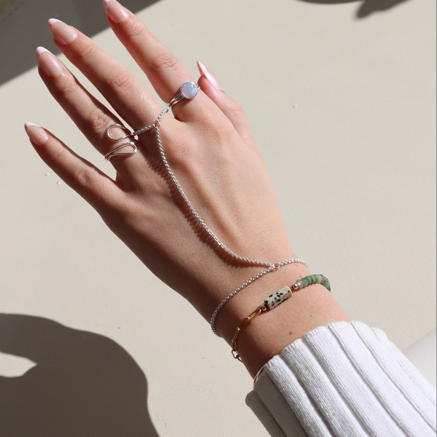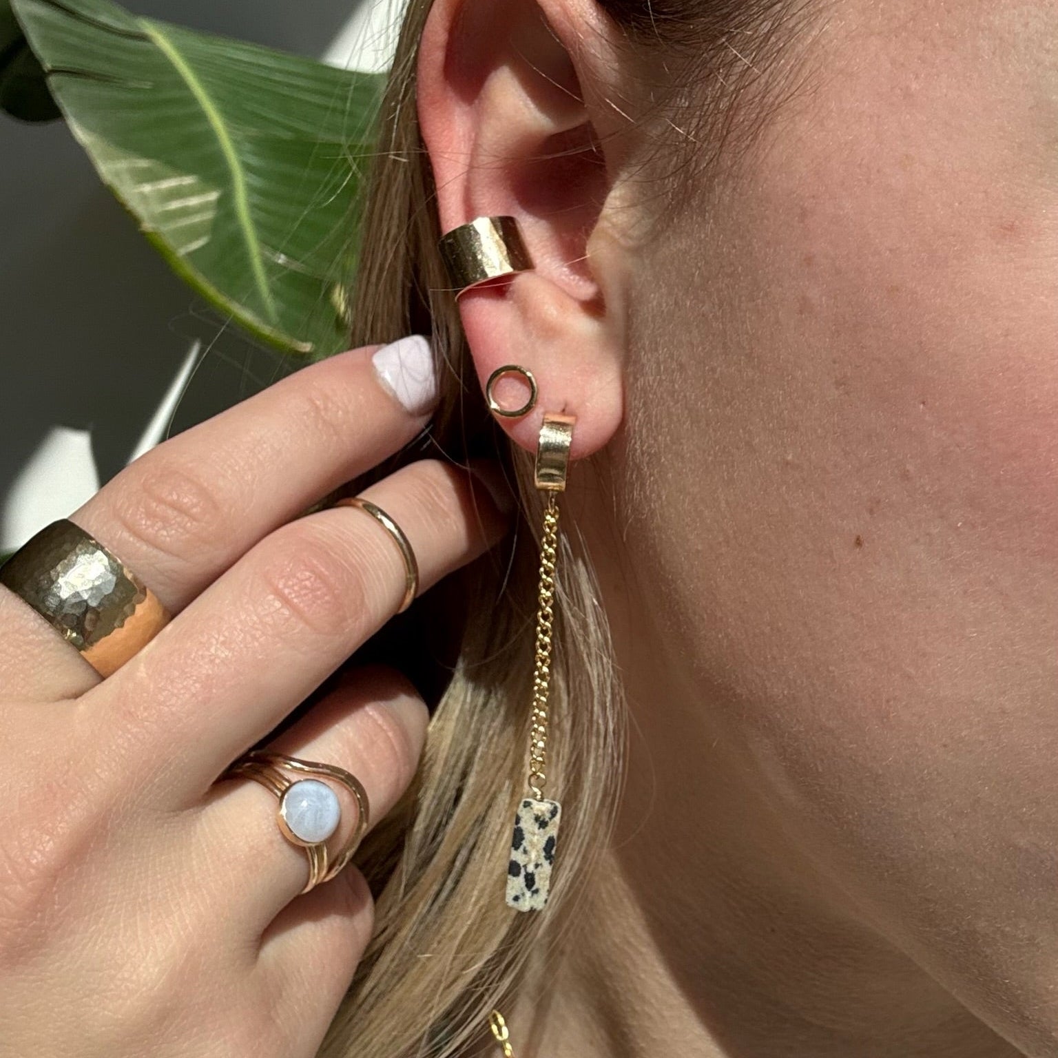 14k gold filled olivia ring paired with cuff ring on a model that is in water.